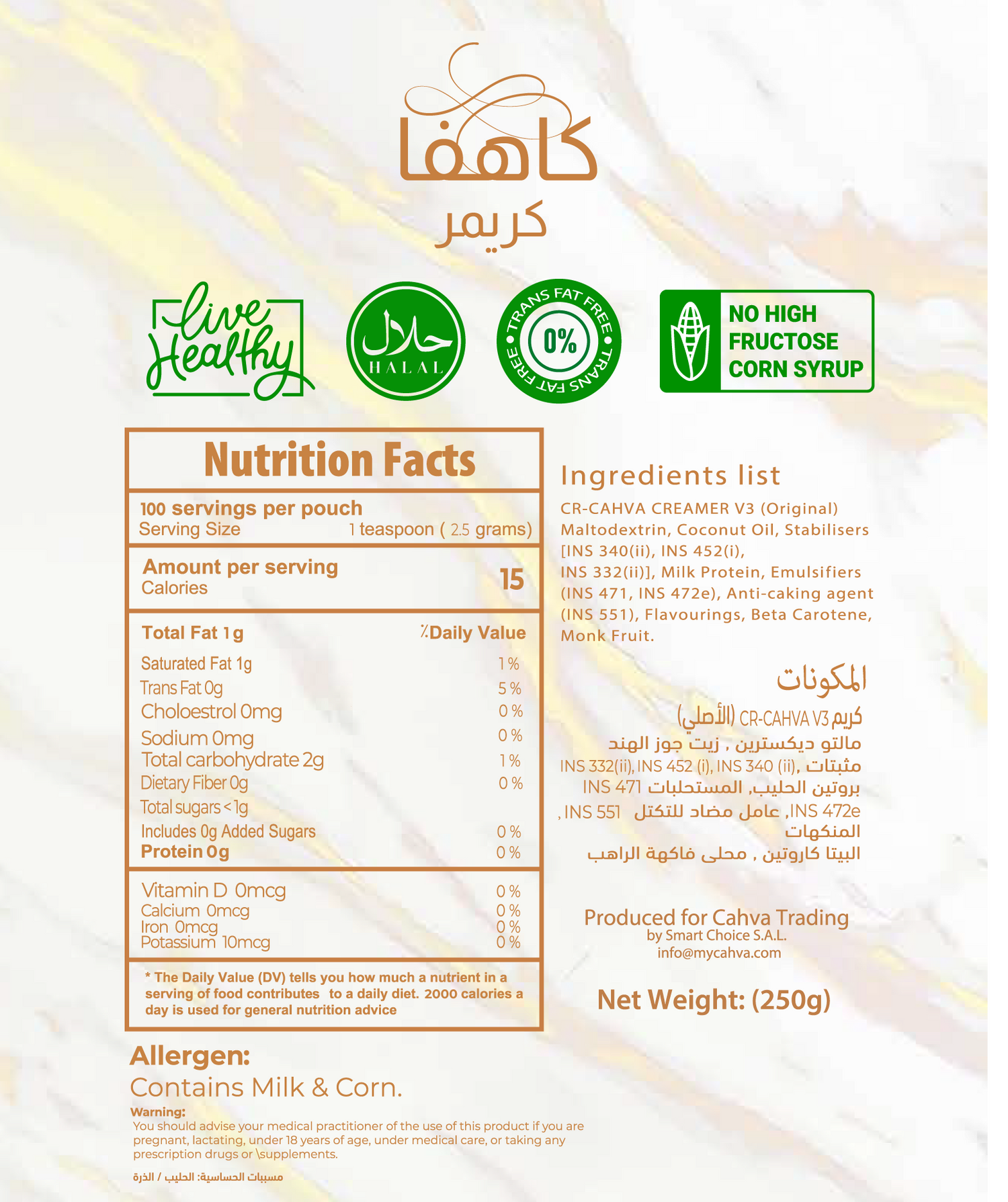Crafted with the purest coconut oil, sourced from lush tropical fields, Cahva delivers a silky texture that embodies the elegance of nature. Alongside coconut oil, Cahva includes stabilizers (INS 340(ii), INS 452(i)), milk protein, emulsifiers (INS 471, INS 472e), anti-caking agents (INS 551), natural flavors, beta carotene, and Monk Fruit, a natural sweetener that is calorie-free and does not raise blood sugar levels, making it ideal for those following a low-sugar diet or managing diabetes.